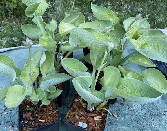 • A gold seedling from Abiqua Drinking Goard. Has the same qualities of its parent with the cupped and corrugated leave but with a nice golden yellow color. Emerges chartreuse and brightens during the growing season. Near white flowers in summer. Matures 11 inches tall and 22 inches wide. Zones 3-9.