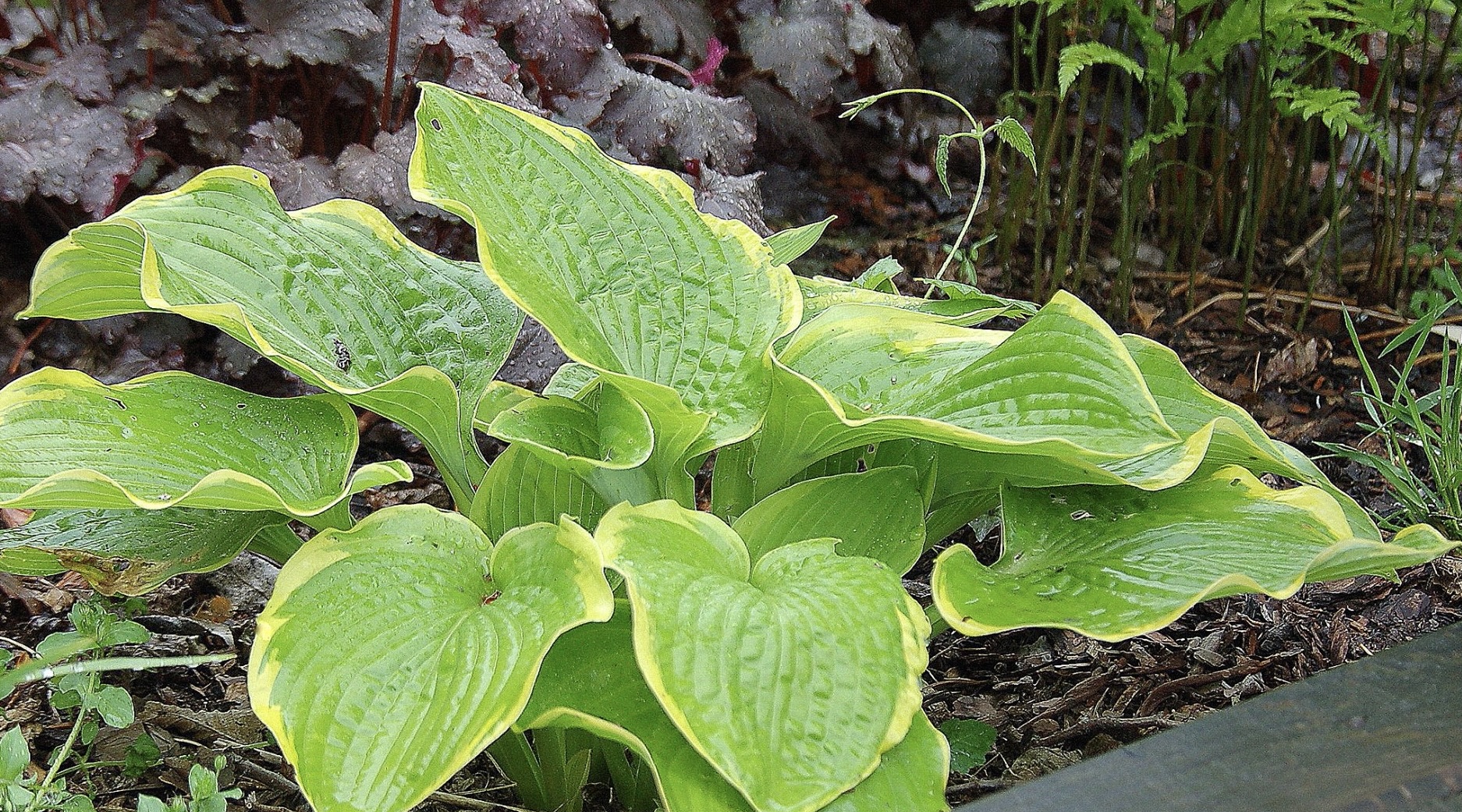 Yellowish-green leaves with a white margin. Holds its nice color well into the season. Slightly corrugated. Lavender flowers early season. Matures 16 inches tall and 40 inches wide. Zones 3-9.