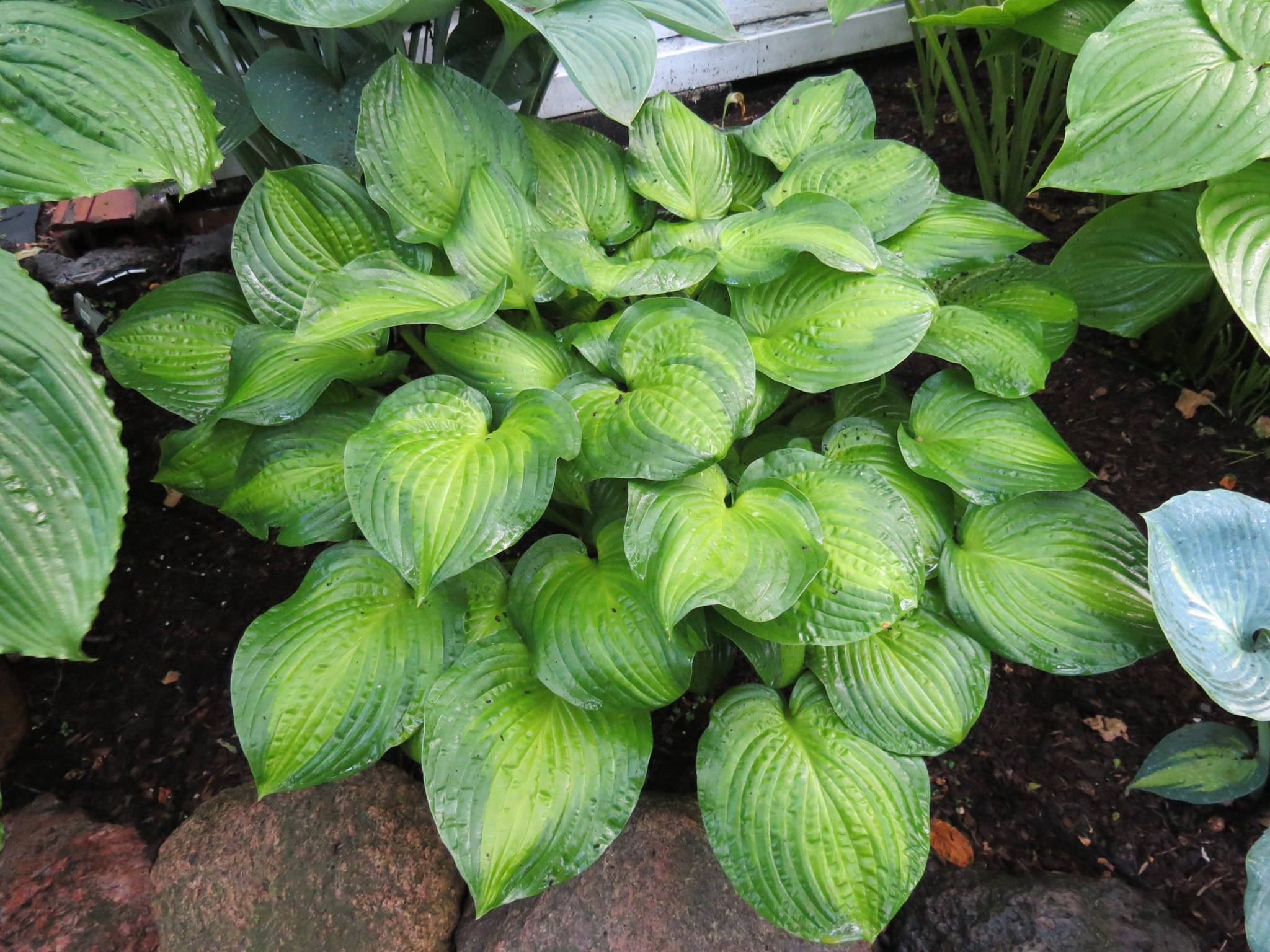 Dark gold centers lighten as the season progresses. Has a very dark green margin. Slightly wavy and slightly corrugated. Pale lavender flowers top the clump. Matures 21 inches high and 47 inches wide. Zones 3-9.