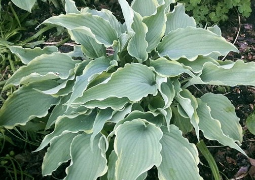 Pointed blue leaves with a very wavy yellow margin that turns creamy-white quickly. A beautiful newer introduction from Belgium. Leaves have a twisted point. Lavender flowers. Matures 16 inches tall and 35 inches wide. Zones 3-9.